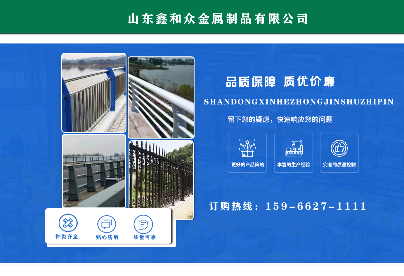 山東鑫和眾金屬制品有限公司主要產(chǎn)品有防撞護(hù)欄,橋梁護(hù)欄,道路護(hù)欄,河道護(hù)欄,不銹鋼護(hù)欄等護(hù)欄。提供設(shè)計方案,一站式定制,包您滿意價格優(yōu)惠,歡迎來電咨詢! 公司常年從事銷售護(hù)欄防撞護(hù)欄,橋梁護(hù)欄,道路護(hù)欄,河道護(hù)欄,不銹鋼護(hù)欄,橋梁鋼護(hù)欄,河道燈光護(hù)欄等。產(chǎn)品廣泛應(yīng)用于橋梁、河道、旅游景區(qū)、道路、公路、公園、小區(qū)、景觀、道路防撞等領(lǐng)域。 公司產(chǎn)品均采用優(yōu)質(zhì)不銹鋼材料,符合相關(guān)標(biāo)準(zhǔn)。各種型號不銹鋼復(fù)合管及護(hù)欄,質(zhì)量嚴(yán)格把控。產(chǎn)品強(qiáng)度高、耐腐蝕、焊接牢固、抗沖擊、性能好,防撞護(hù)欄結(jié)構(gòu)簡單、美觀實(shí)用大方。 歡迎前來訂購!...